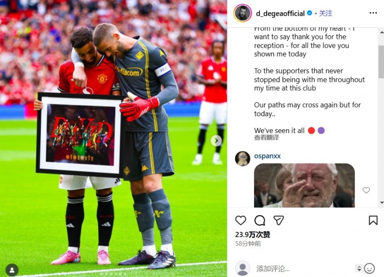 在酬酢媒体上,德赫亚写说念:关于我和我的家东说念主而言,重返老特拉福德是一个神奇的工夫,这里是我的家。我打心底思说感谢你们今天的迎接,感谢你们今天向我展示出的所有这个词的爱!