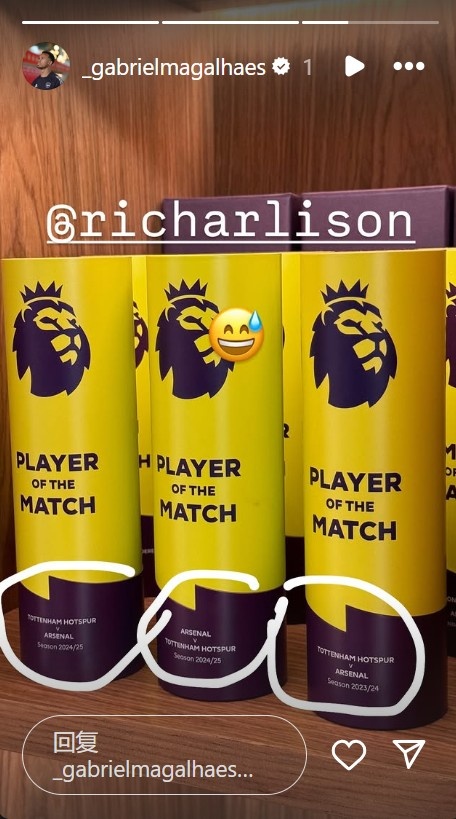 赛后,理查利森在个东谈主社媒晒了他拿着全场最好球员奖杯的相片,并记号了阿森纳后卫加布里埃尔。随后,加布里埃尔更新社媒,晒出我方3次拿到英超北伦敦德比全场最好的奖杯给以抗拒,他也艾特了理查利森。