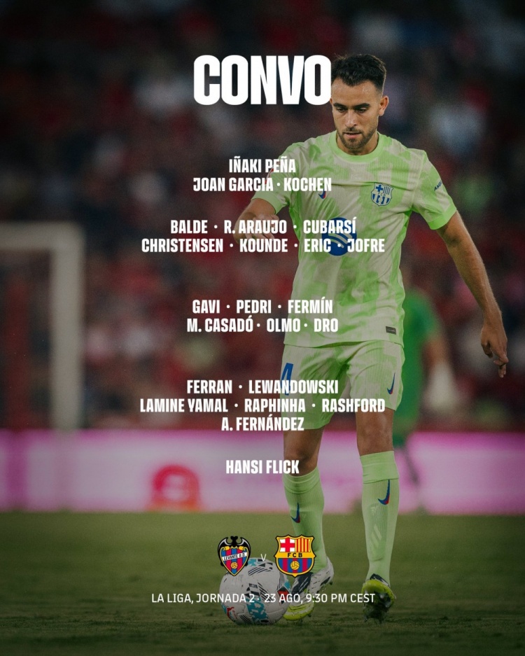 巴萨客战莱万特名单:莱万总结,亚马尔、拉什福德、奥尔莫在列