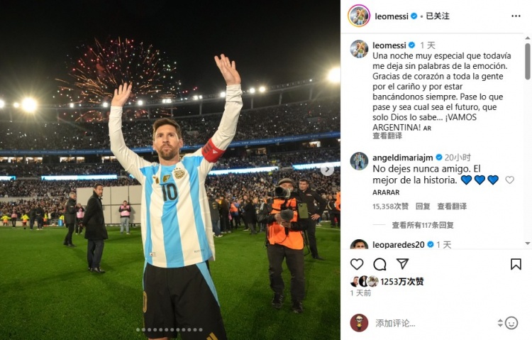 梅西写谈:“一个令我焕发到于今仍无法言表的稀薄夜晚,忠心感谢统统东谈主的老成与历久如一的赞助。岂论发生什么,岂论往日何如,惟有天主清醒……阿根廷加油!”