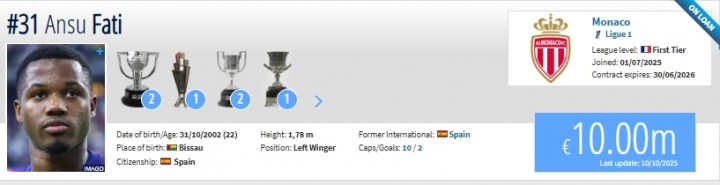 10月10日讯 德转更新了法甲的身价,摩纳哥时尚法蒂身价从500万欧上升至1000万欧。