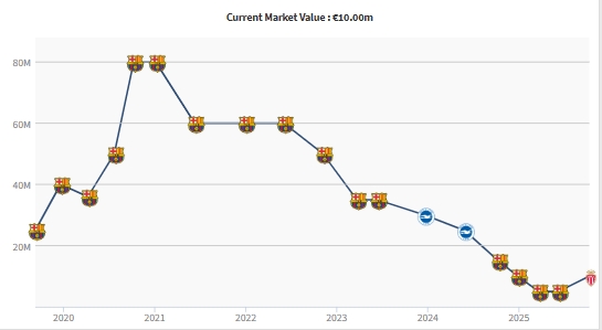 这亦然法蒂近5年来初度身价上升,在5年前他的巅峰身价曾达到8000万欧,随后一说念下滑至500万欧。