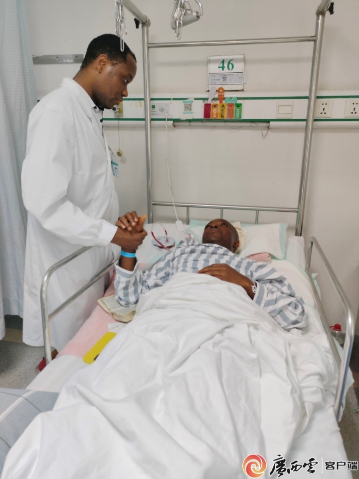 10月9日,老乡阿布(左)在病房看望术后的阿萨莫阿/广西医科大学第一附属病院脊柱骨病外科供图