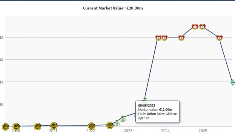 10月14日讯 德转更新球员身价,24岁先锋博尼法斯从4000万欧跌至2000万欧。
