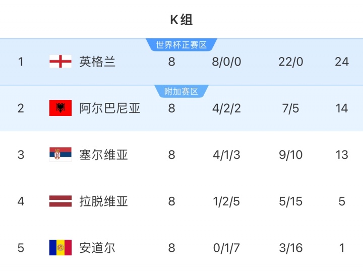 11月17日讯 英格兰2-0礼服阿尔巴尼亚后,世初赛欧洲区K组8轮比赛一都戒指,阿尔巴尼亚小组第二获取附加赛履历。