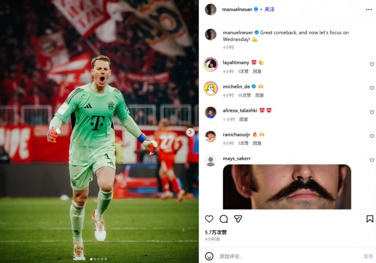 欧冠将战阿森纳!诺伊尔社媒:伟大的逆转!咫尺专注于周三的比赛