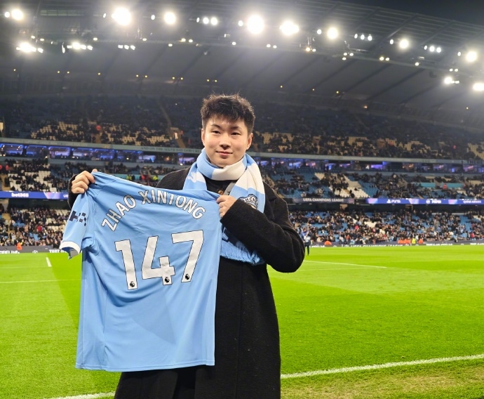 11月26日讯 欧冠联赛阶段第5轮曼城主场迎战勒沃库森,斯诺克世锦赛冠军赵心童现场不雅赛,获赠号码为“147”的曼城球衣,并在社媒为曼城加油:“Come on City!!!😎”