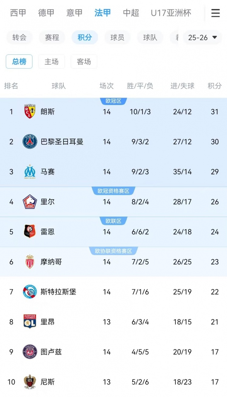 数据统计清楚,巴黎在14轮联赛事后未能登顶积分榜,这亦然近10年来第3次出现。而此前2次(16-17赛季第3、20-21赛季第4),巴黎在当赛季均未能最终夺得法甲冠军。