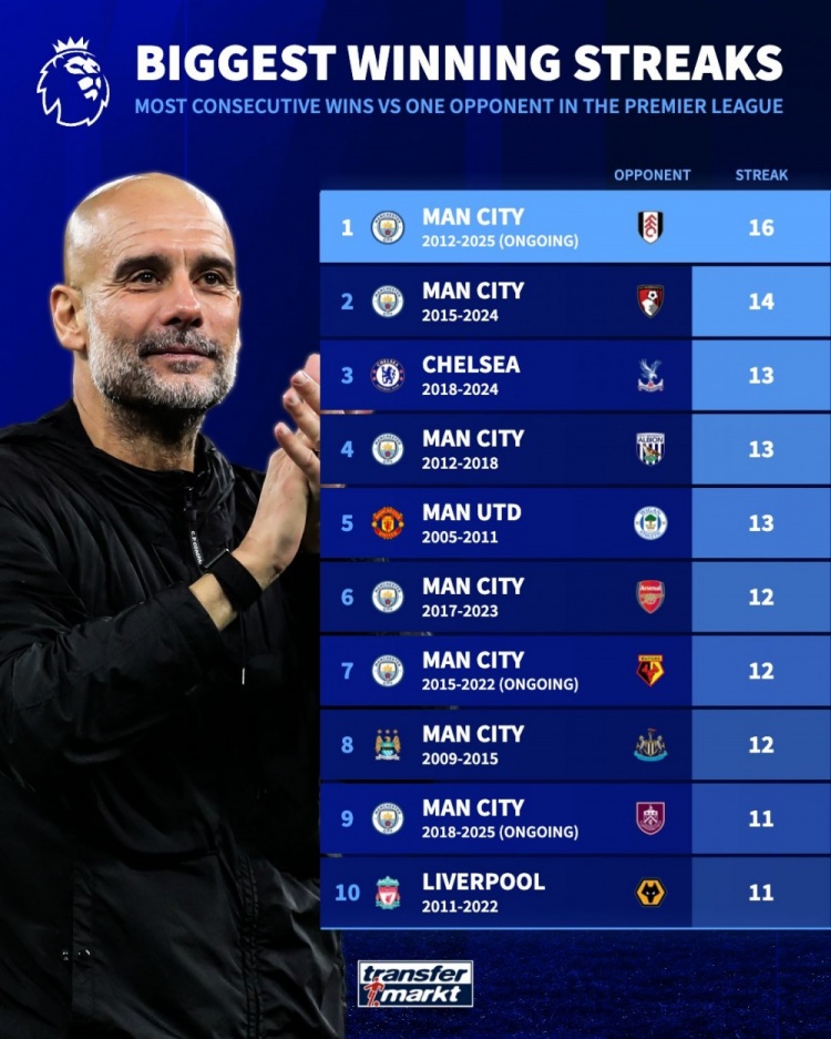 1.曼城 (对富勒姆),2012-2025年 (未终结),16连胜