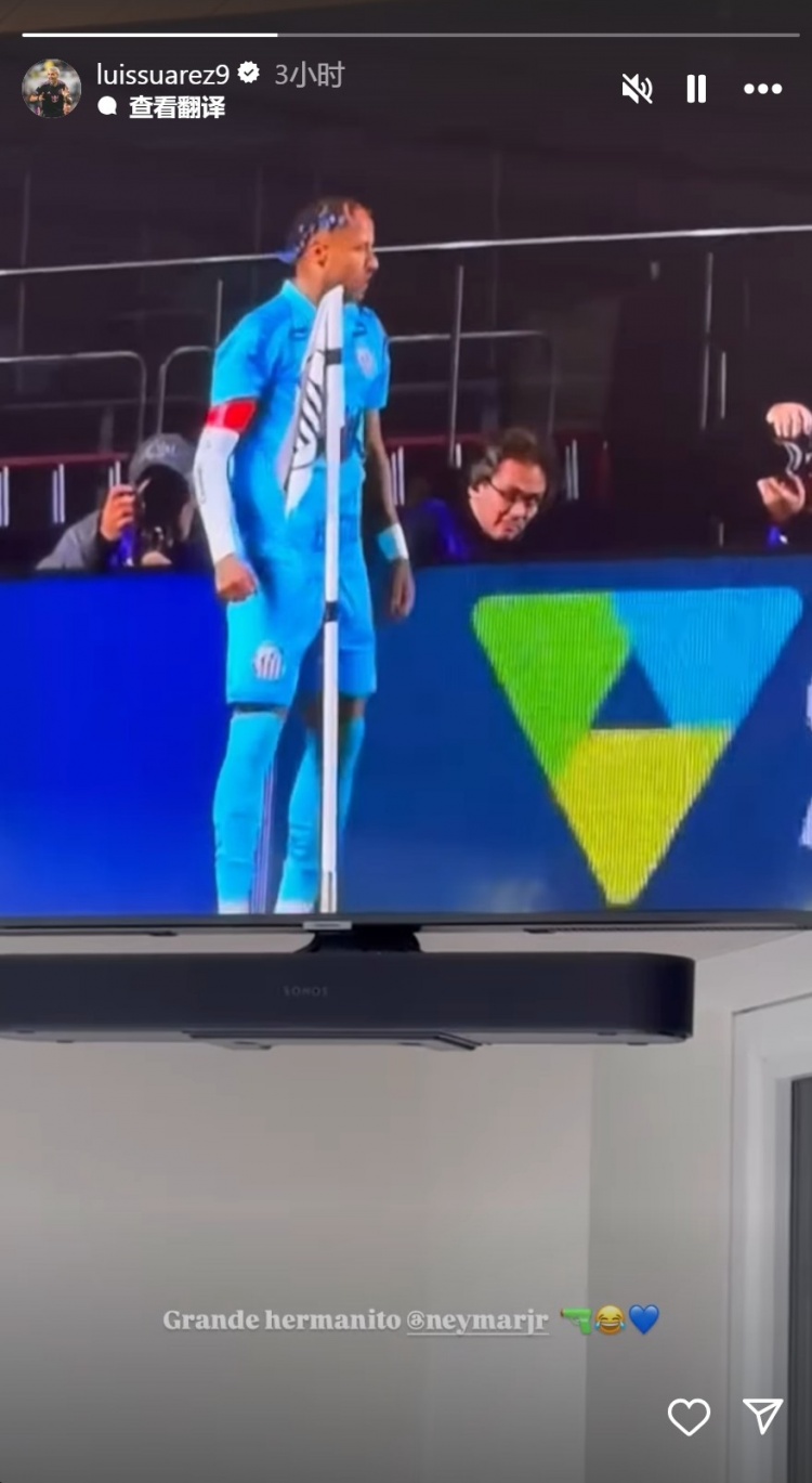 苏亚雷斯更新社媒动态,晒出内马尔庆祝进球的视频,为老队友奉上荧惑,配文:“了不得的昆玉,内马尔。”