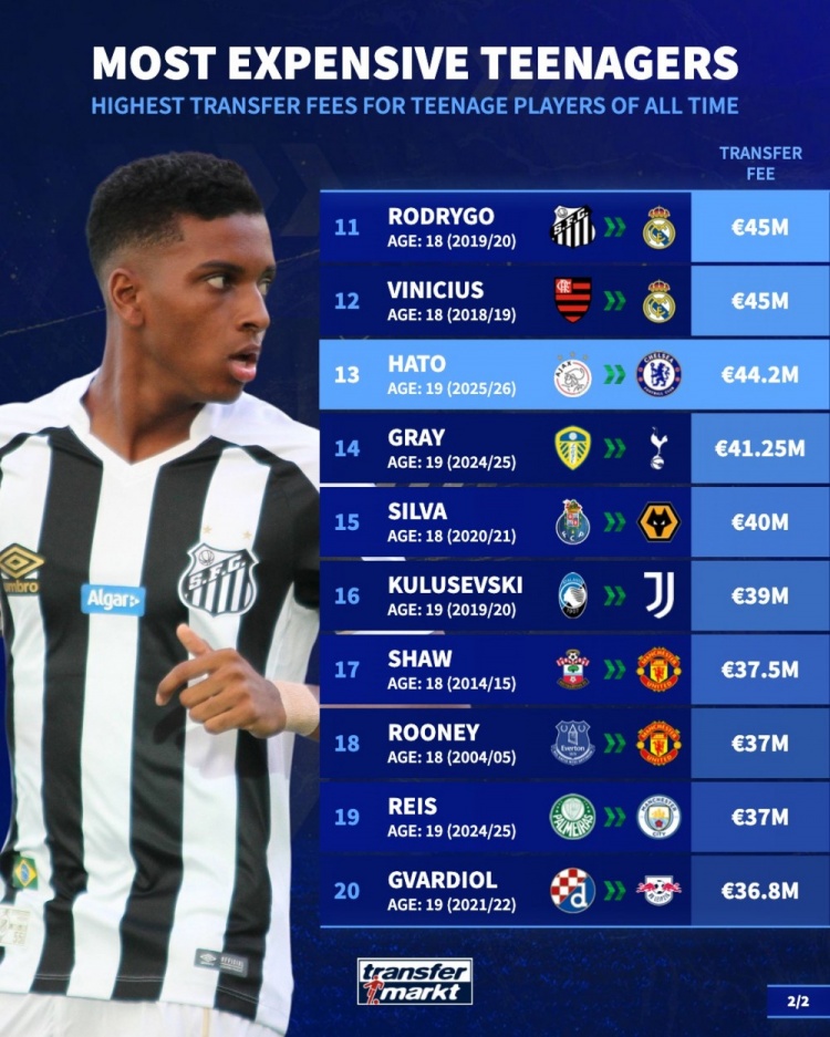8月5日讯 德国转会市集统计了足坛历史U20球员(不包含20岁)的转会费,并排出榜单,姆巴佩、菲利克斯、德里赫特排行前三。