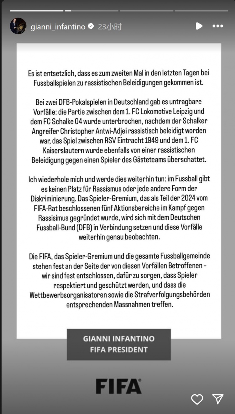 8月19日讯凯 外洋足联主席因凡蒂诺更新社媒动态,对德国杯种族愤激事件发声。