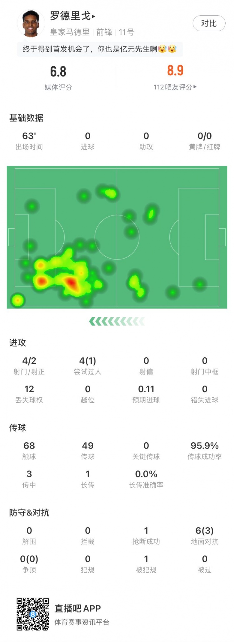 8月25日讯 西甲联赛第2轮,皇马客场对阵皇家奥维耶多。本场比赛皇马球员罗德里戈首发出场63分钟,以下为他在本场数据: