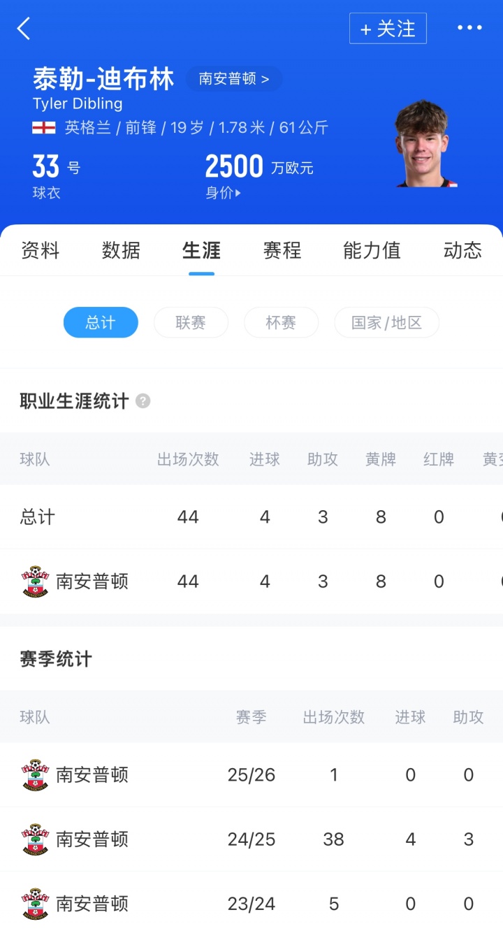 迪布林——英格兰U21国脚——在2023年8月年仅17岁时便为南安普顿一线队完成首秀。
