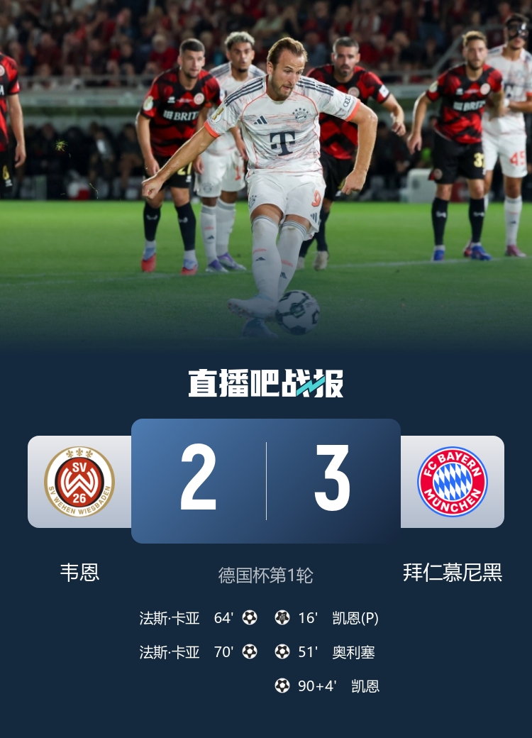 德国杯第1轮,拜仁3-2险胜德丙队韦恩,凯恩梅开二度+踢丢点球。