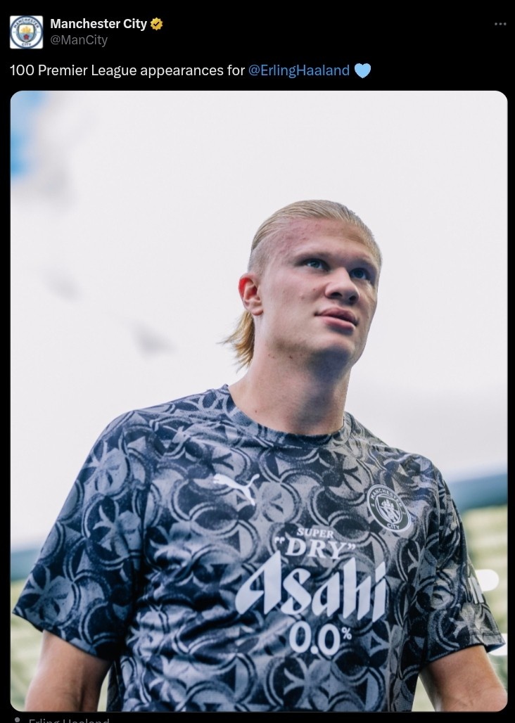 本场比赛亦然哈兰德生活第100次代表曼城在英超出场,此前的比赛他为球队孝敬87球17助攻,曼城官推也晒照为其回来。