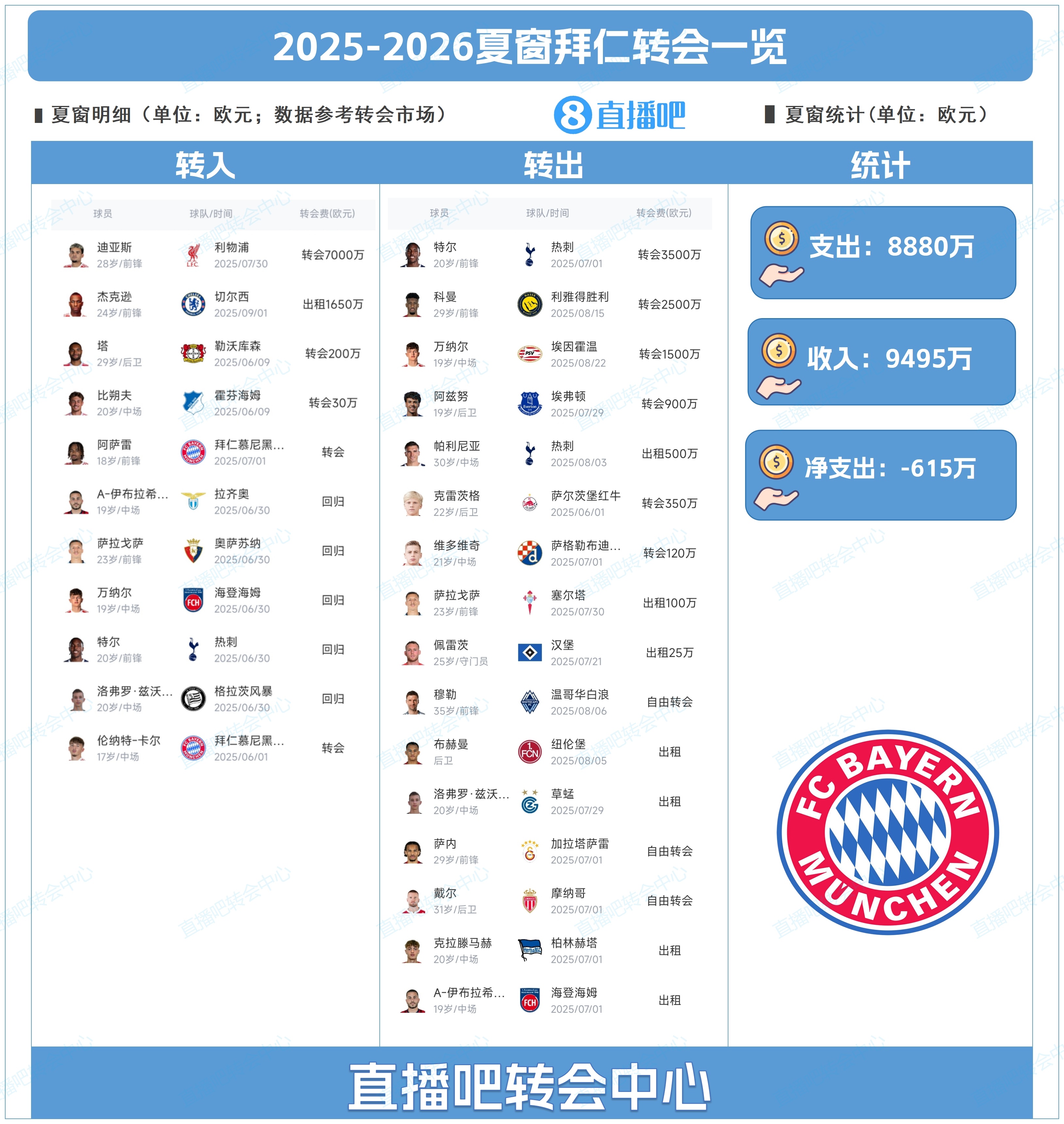 仅签4东说念主!拜仁夏窗:标王迪亚斯&租杰克逊,16东说念主离队&净收入615万