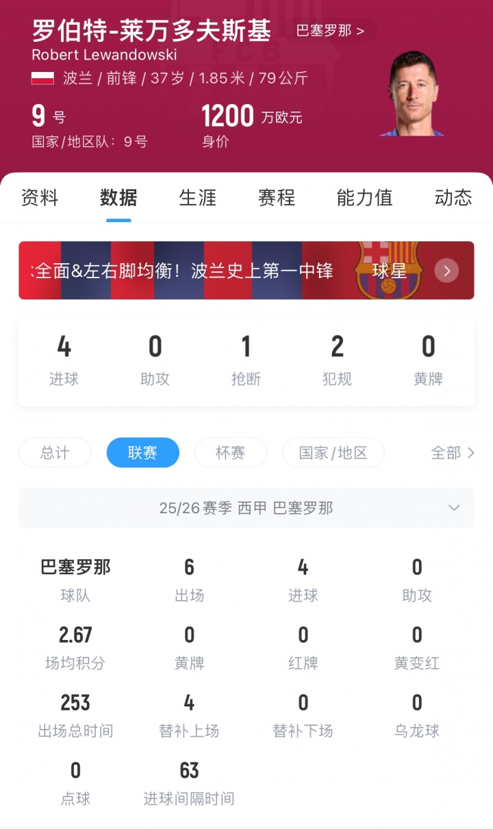莱万现年37岁,他本赛季于今为巴萨出战6场西甲,打进4球,现身价1200万欧,他与巴萨的协议将于来岁到期。