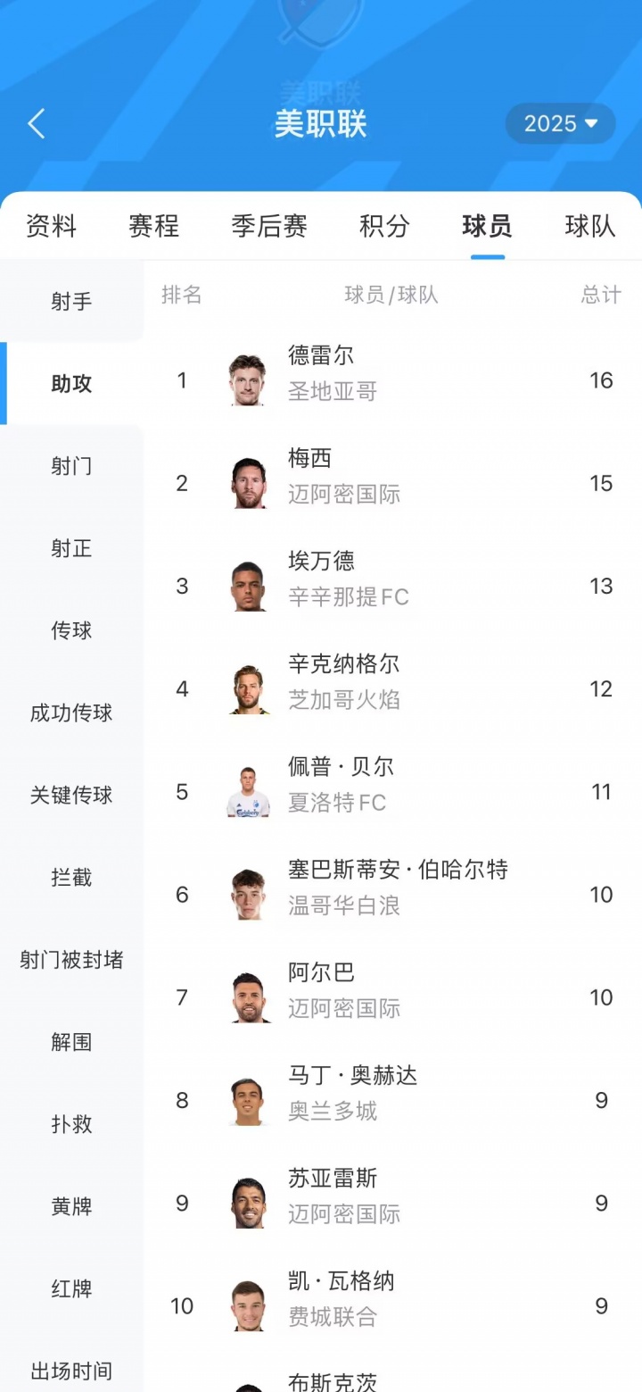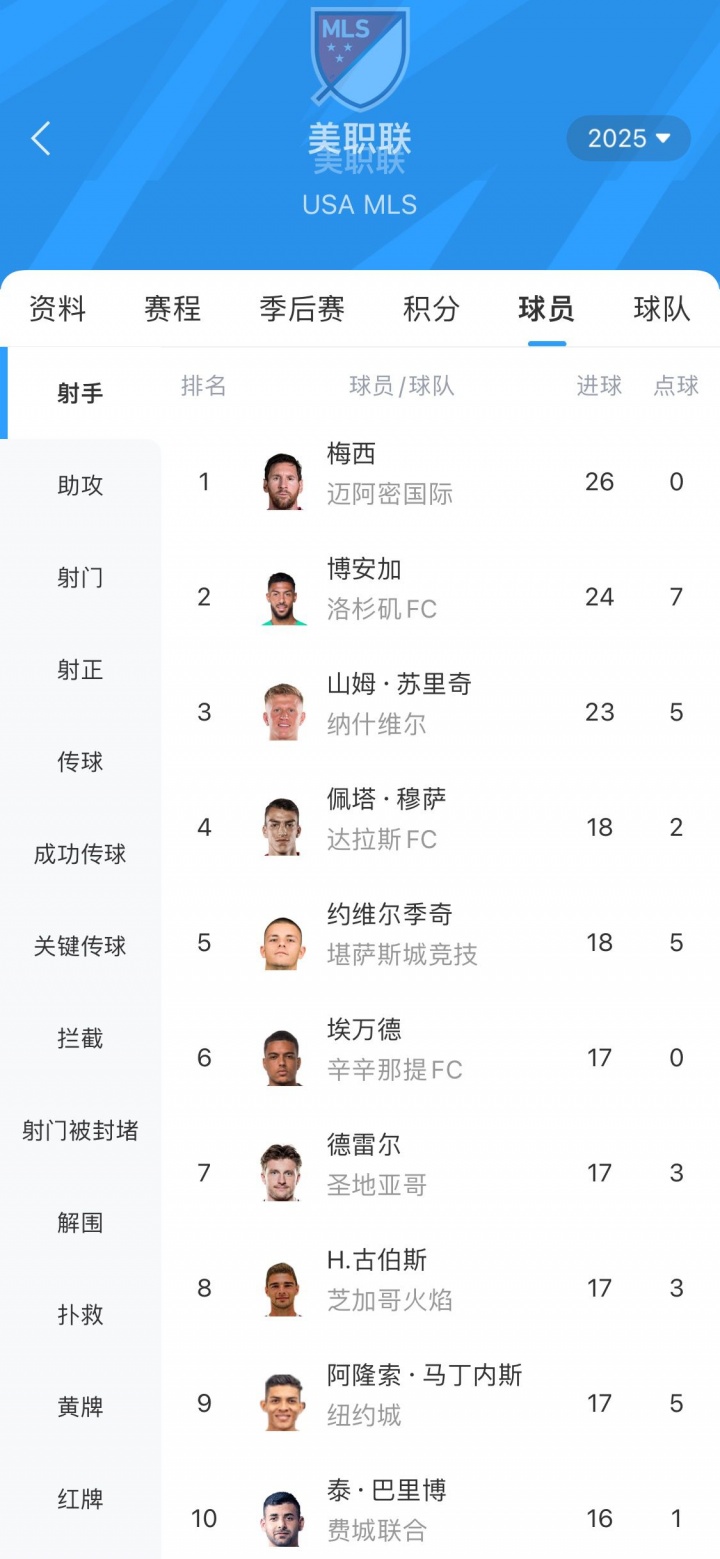 冲击助攻王!梅西26球0点领跑MLS弓手榜,15助排行助攻榜第二