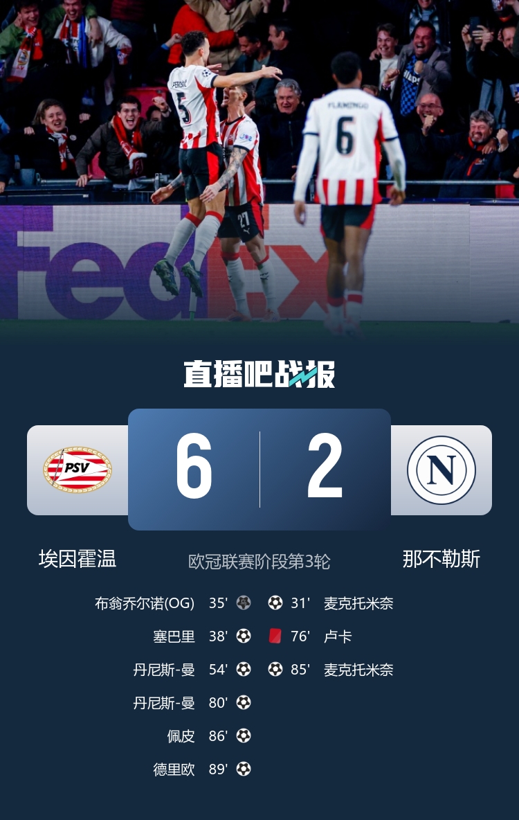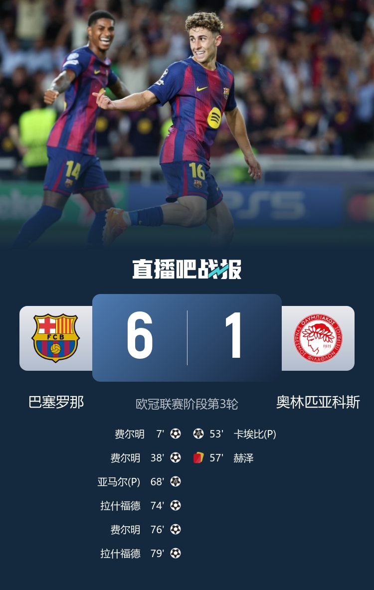 欧冠第3轮第一比赛日9场比赛一谈扬弃,这9场比赛一共轰进43球(场均4.8球),其中有三支球队单场轰出6+进球(巴萨6-1奥林匹亚科斯、巴黎7-2勒沃库森、埃因霍温6-2那不勒斯)。