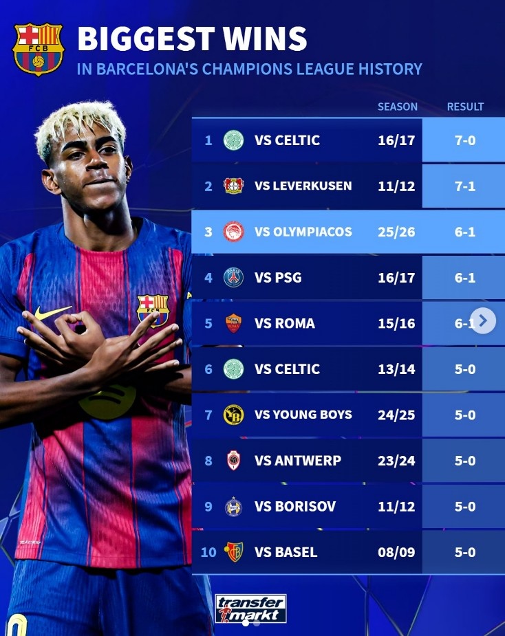 10月22日讯 在本轮欧冠,巴萨6-1大捷奥林匹亚科斯。德转也盘货了巴萨队史在欧冠最大比分成功记录榜,具体如下: