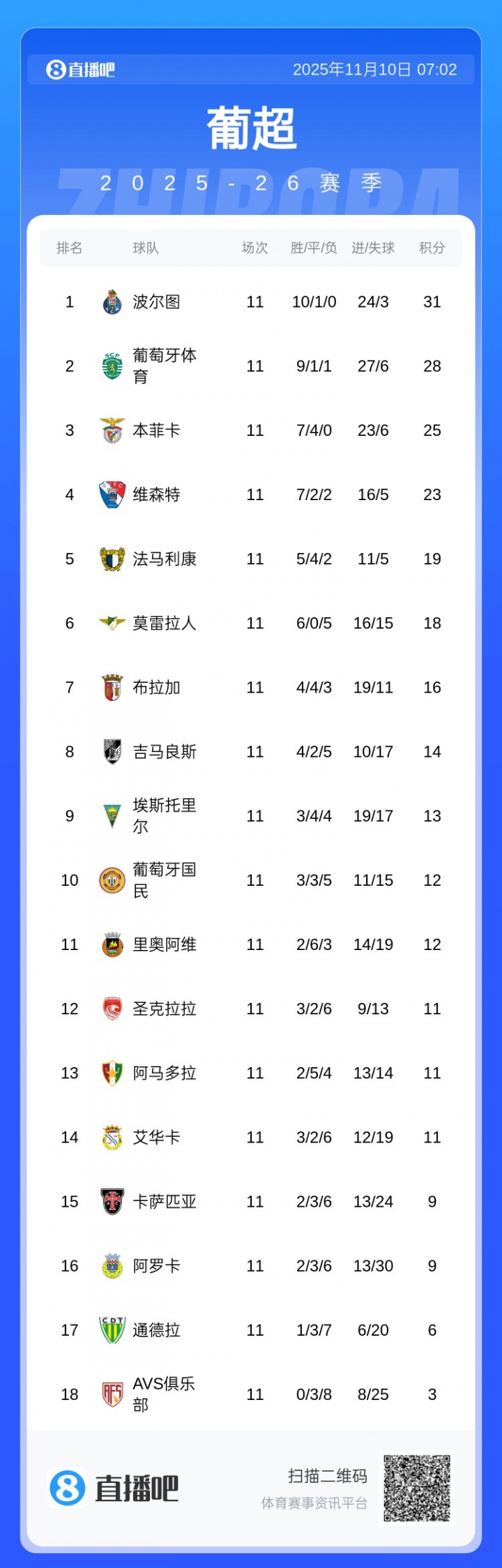 11轮联赛事后,本菲卡暂积25分名次积分榜第3,过期榜首的波尔图6分。