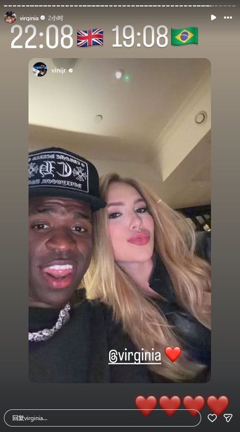 本场比赛,维尼修斯女友弗吉尼亚身穿巴西7号球衣赶赴现场不雅战。赛后维尼修斯晒出了与弗吉尼亚的合照。