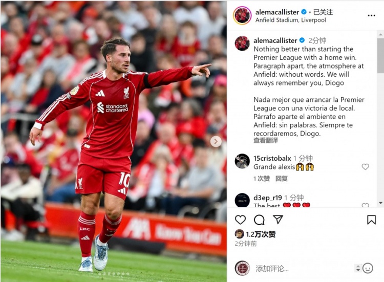 麦卡利斯特社媒:以主场见效开启英超赛季,始终诅咒若塔