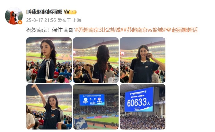 8月17日讯 前女足国门赵丽娜在社媒晒照,共享她现场不雅战“苏超”南京主场对阵盐城的相片,并道喜南京得回得手。