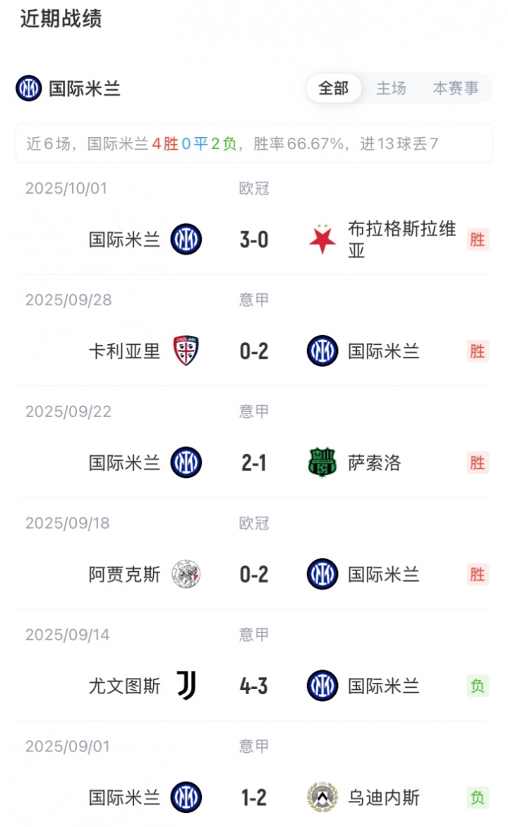 10月4日讯 意甲第6轮,国米主场迎战克雷莫内塞比赛行将打响,赛前首发出炉。