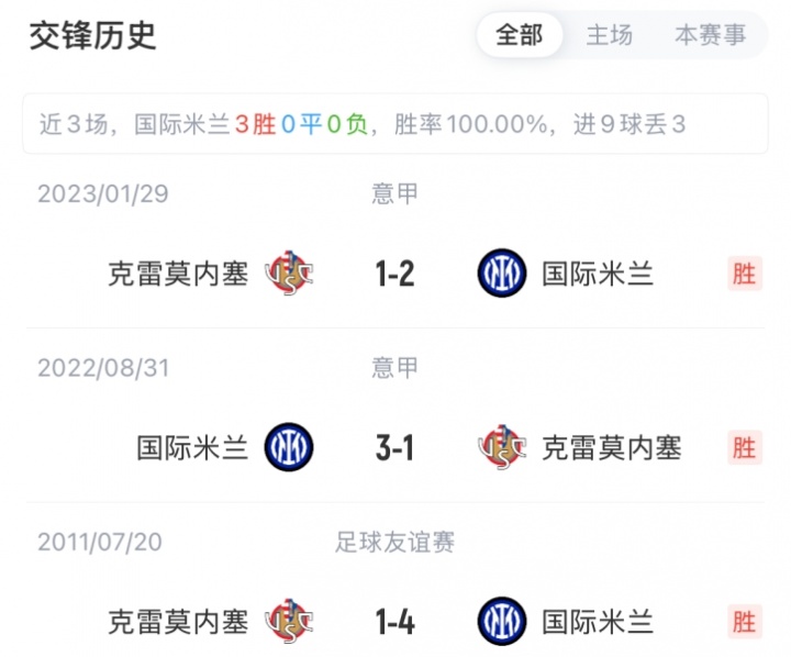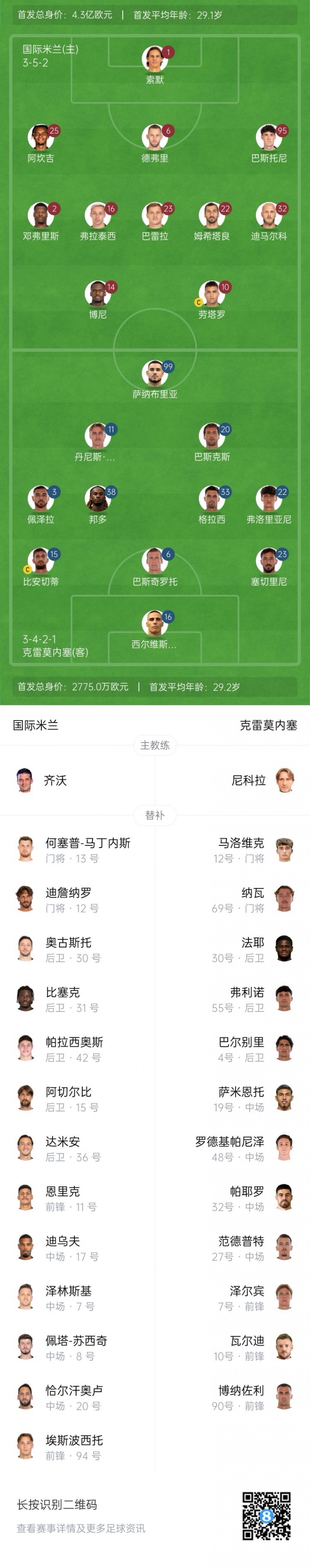 国米vs克雷莫内塞首发:劳塔罗搭档博尼,弗拉西洋先发恰20替补