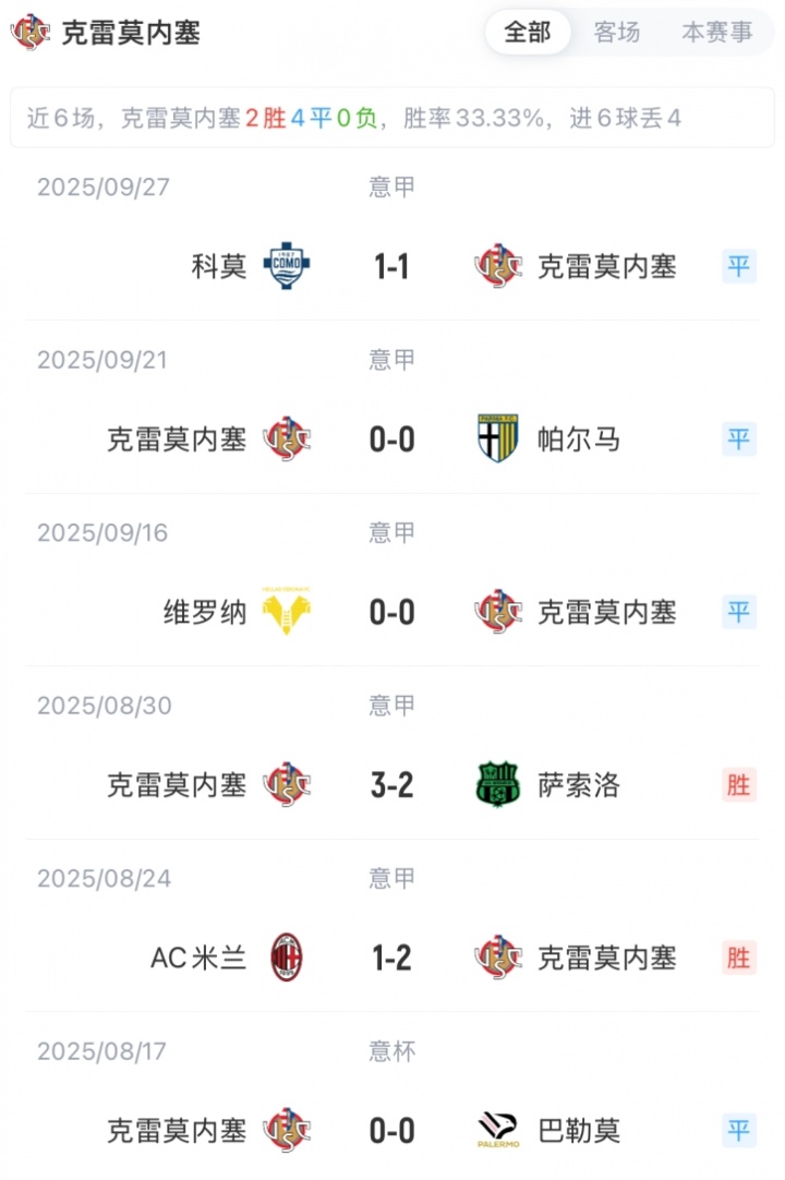 克雷莫内塞首发:16-西尔维斯特里、15-比安切蒂、6-巴斯奇罗托、23-塞切里尼、3-佩泽拉、38-邦多、33-格拉西、22-弗洛里亚尼、11-丹尼斯·约翰森、20-弗兰科·巴斯克斯、99-萨纳布里亚