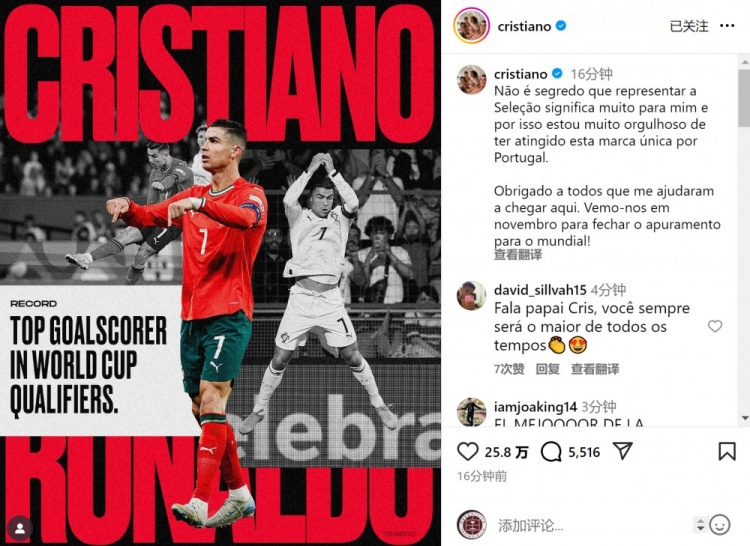 加冕世初赛弓手王!C罗社媒:很自重为葡萄牙已毕私有里程碑
