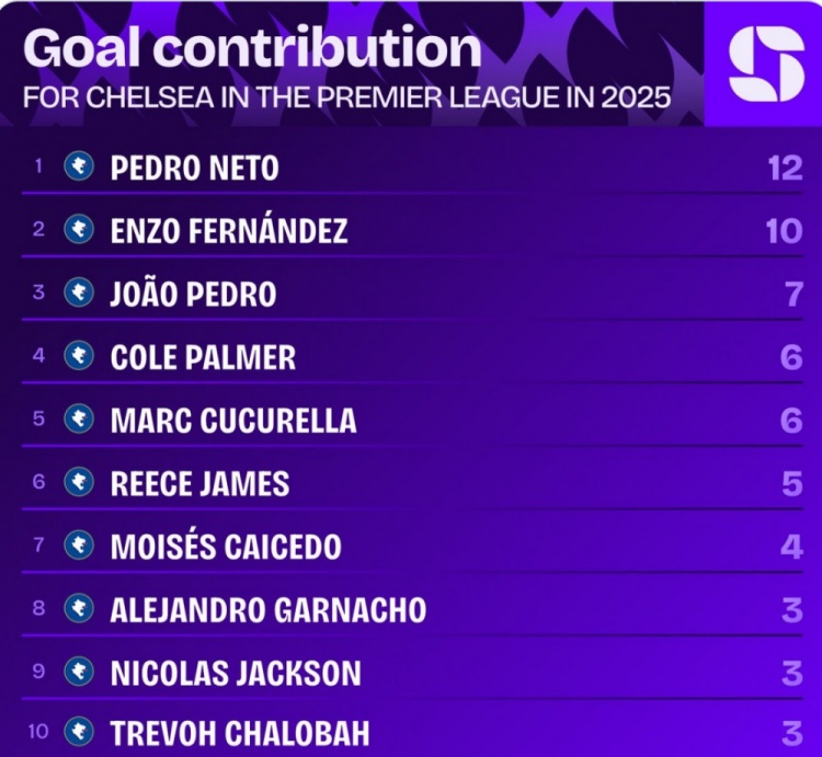 据Squawka统计,佩德罗-内托2025年在英超打进6球,助攻6次,他是切尔西队内同时唯独英超进球5+且助攻5+的球员。