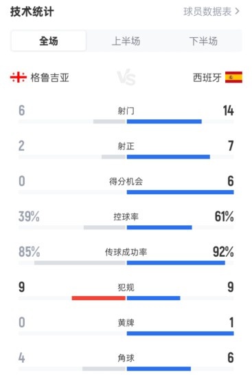 格鲁吉亚0-4西班牙全场数据:射门6-14,射正2-7,控球率39%-61%