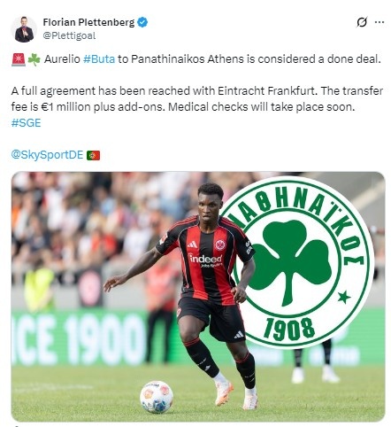8月2日讯 据德国天外体育记者Florian Plettenberg报谈称,法兰克福后卫奥雷利奥-布塔行将加盟雅典帕纳辛奈科斯。