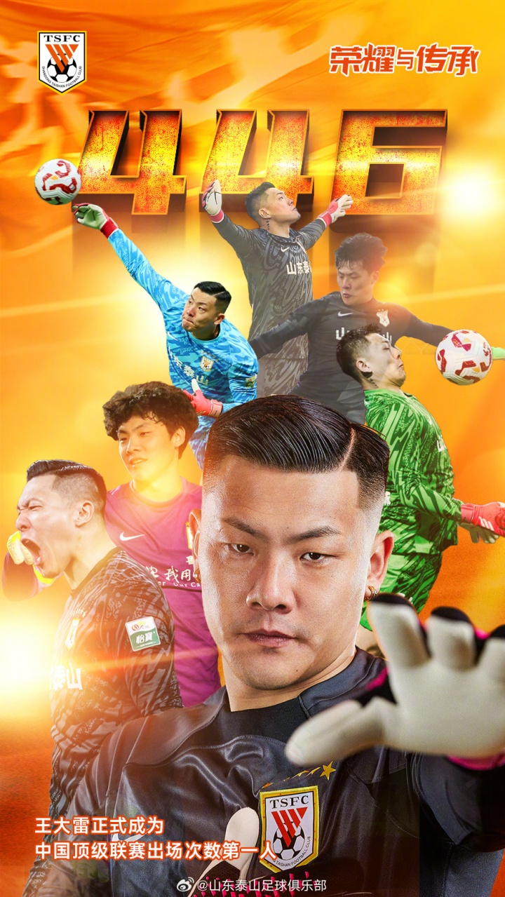 在本日山东泰山3-0打败梅州客家的比赛,王大雷首发登场,以446次出场特出汪嵩,领路成为中国顶级联赛出场次数第一东说念主。