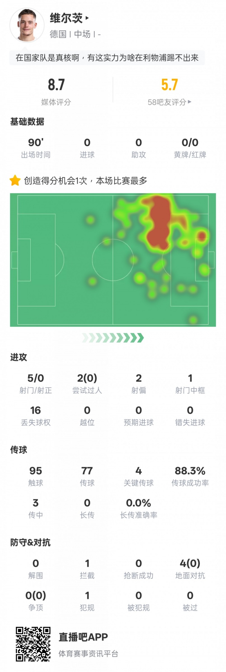 维尔茨本场数据:1中框4要津传球+创造1次进球契机,评分8.7
