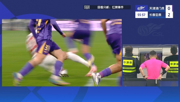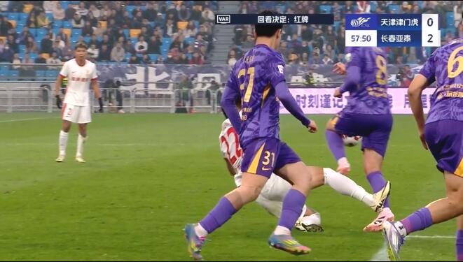10月25日讯 津门虎vs亚泰第58分钟,王禹放铲蹬踏哈达斯小腿,主裁先是给了黄牌,随后永劫辰不雅看VAR回放后改判红牌,将其直红罚下!