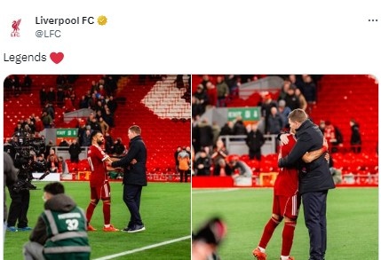 利物浦官方推特发文写谈:外传!并配上了杰拉德和萨拉赫在场边拥抱的图片。