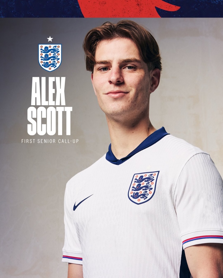 英格兰队公布新一期名单,伯恩茅斯22岁中场斯科特初度入选,英格兰队官方社媒晒出斯科特的海报,对他默示道贺。