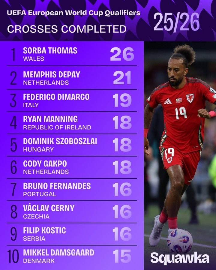 11月20日讯 本届世欧预小组赛还是告一段落,squakwa也统计了本届赛事奏效传中情况,威尔士边锋索尔巴·托马斯领跑。