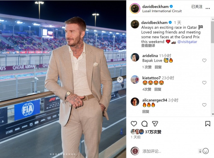 12月2日讯 贝克汉姆更新社媒动态,晒出不雅战F1卡塔尔大奖赛的像片。