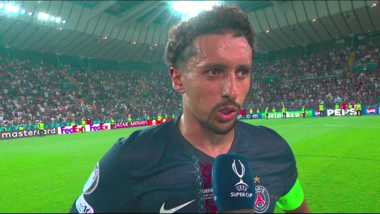 8月14日讯 在得回欧洲超等杯后,巴黎圣日耳曼后卫马尔基尼奥斯在摄取Canal+采访时向球队门将舍瓦利耶示意道喜。