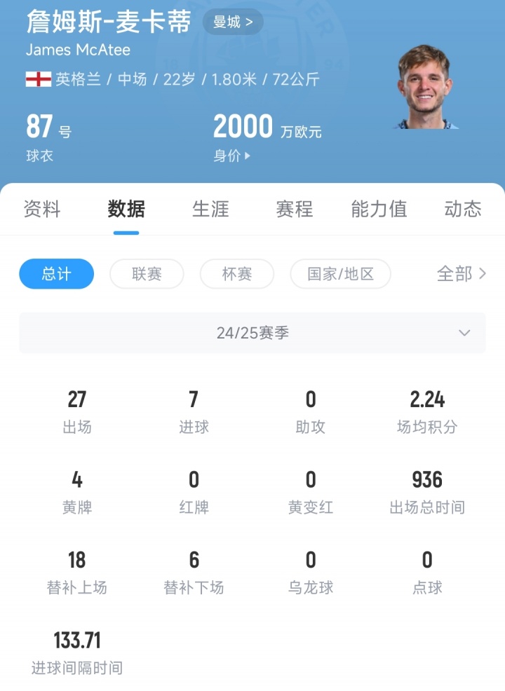 22岁的英格兰中场麦卡蒂,上赛季代表曼城出战27场比赛,打入7球,当今麦卡蒂的德回身价为2000万欧元。
