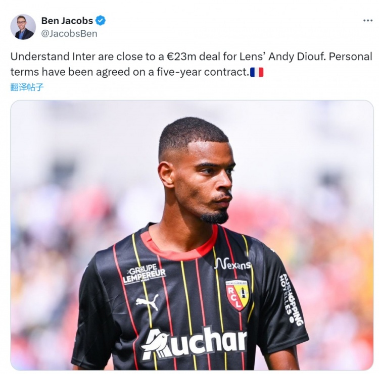 雅各布斯线路,国米接近以2300万欧的价钱签下朗斯中场迪乌夫,已与这位法国球员就为期5年的合同完满左券。