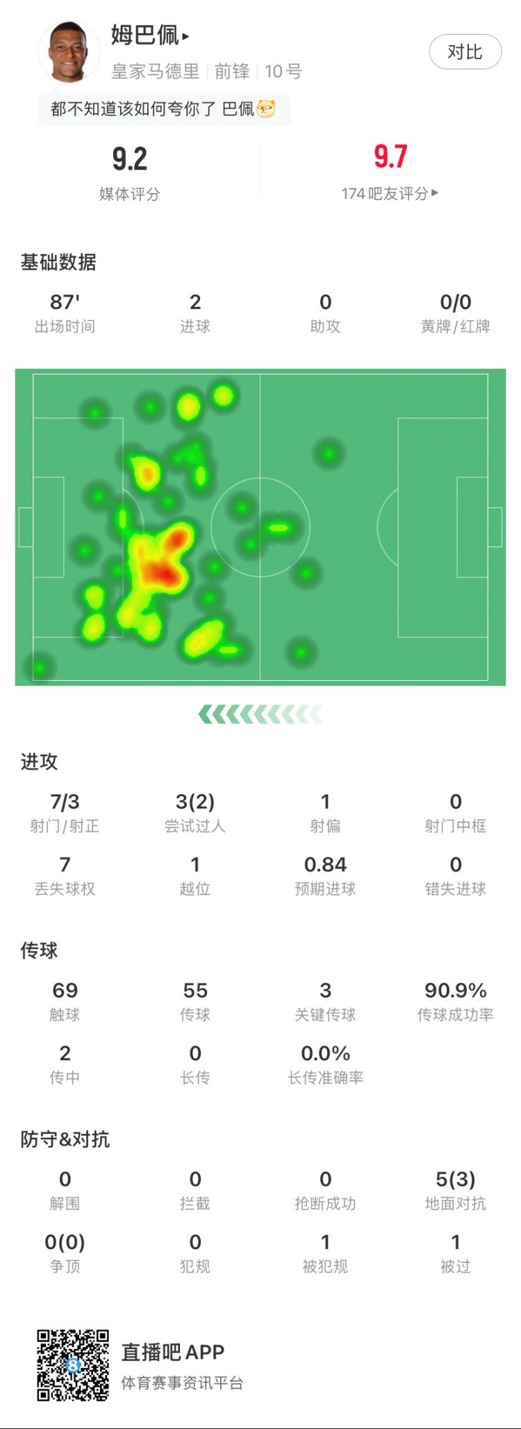 梅开二度!姆巴佩全场数据:2进球,7次射门3次射正,3次要津传球
