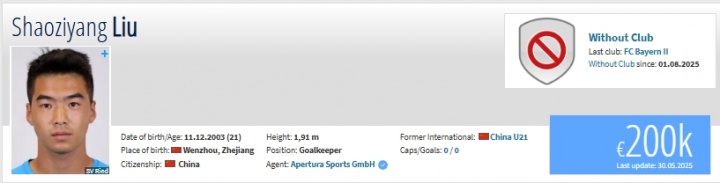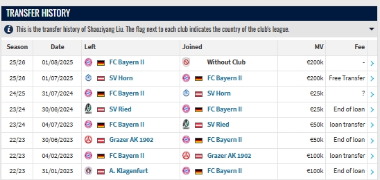 此前德转裸露,刘邵子洋解放身离开奥地利乙级球队SV霍恩,“加盟”拜仁二队。