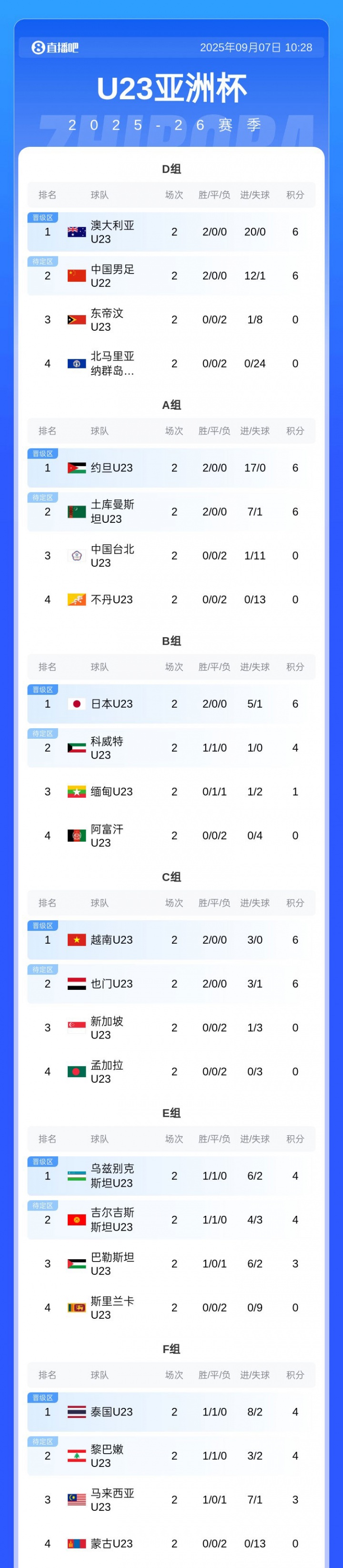 09月07日讯 U23亚初赛前两轮戒指,中国U22国足首场2-1险胜东帝汶,次轮10-0大捷北马里亚纳群岛,现在2胜进12球丢1球积6分排名小组第二,净胜球11球。