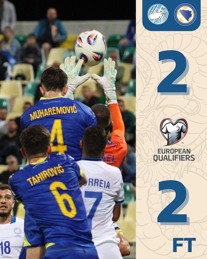 此役上半场卡蒂奇为波黑先拔头筹,迈克尔乌龙,波黑2-0卓绝,上半场补时阶段莱菲扳回一城,波黑2-1卓绝塞浦路斯,下半场第96分钟皮塔点射攻入绝平进球,最终塞浦路斯主场2-2战平波黑。